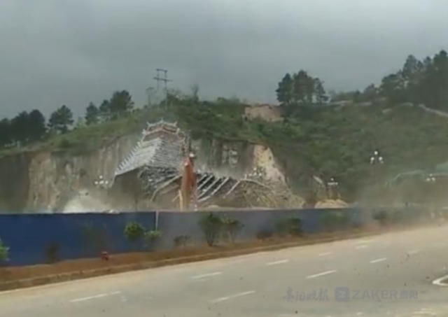 4月5日,貴州凱里。當地出現強對流天氣,部分地區(qū)出現9級風,一座23層在建鼓樓瞬間被風刮倒,無人員傷亡。目前當地已展開受損建筑的核查工作。